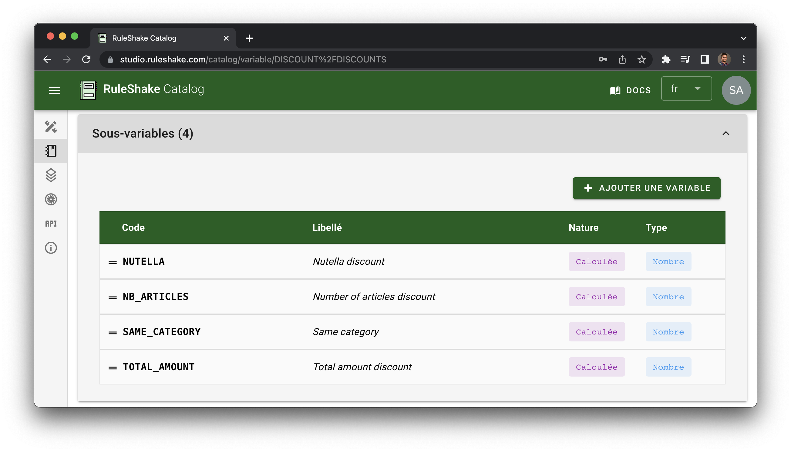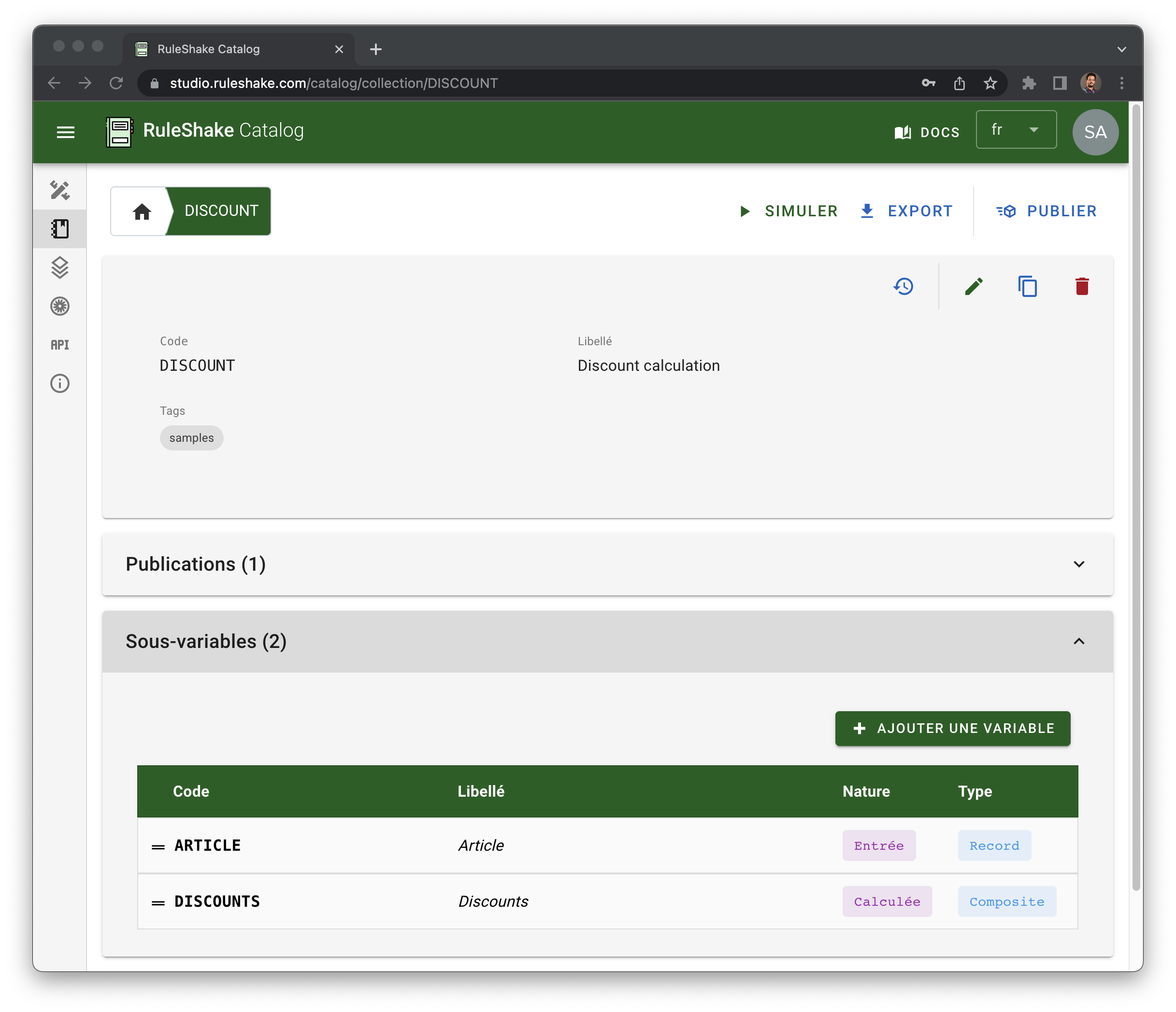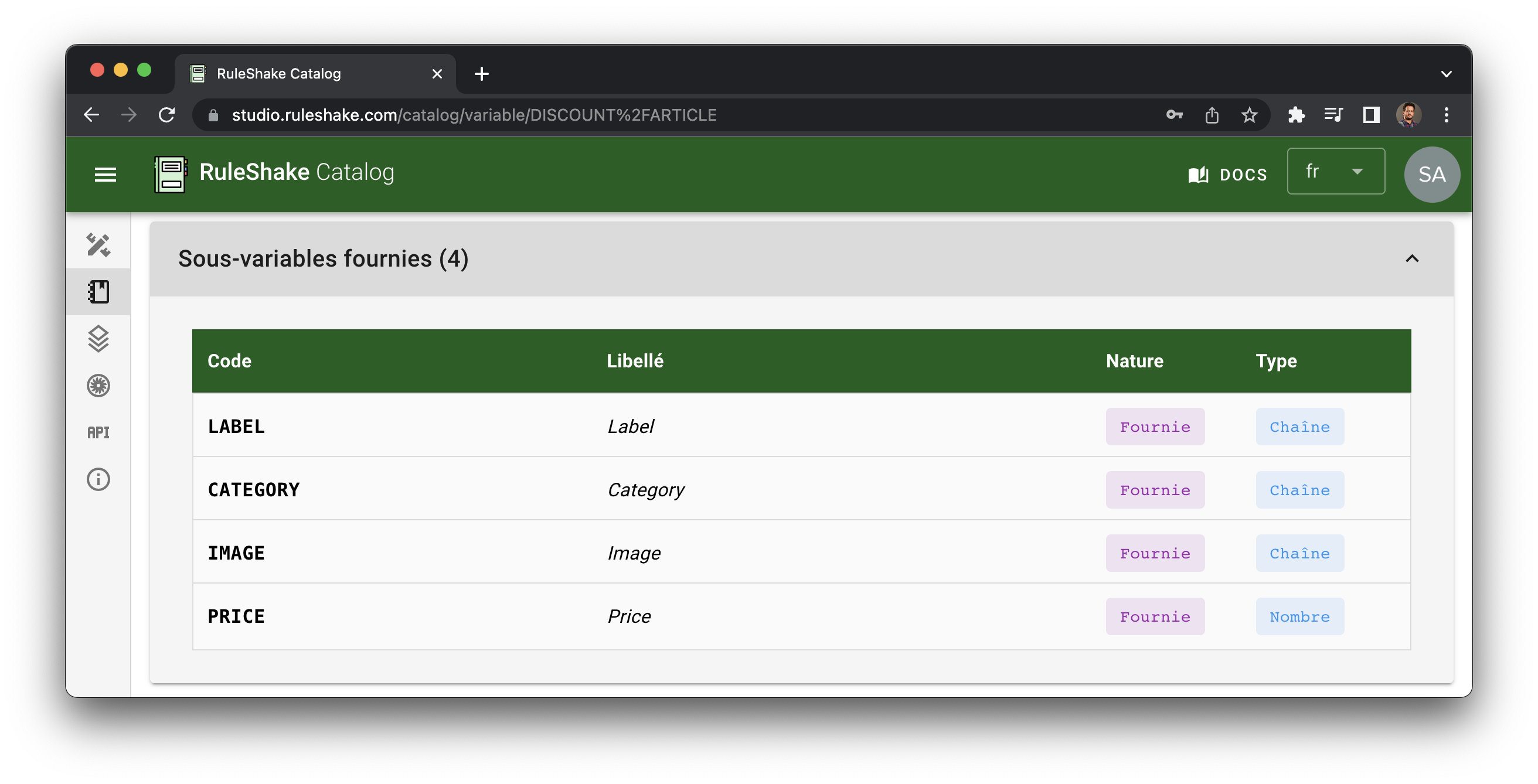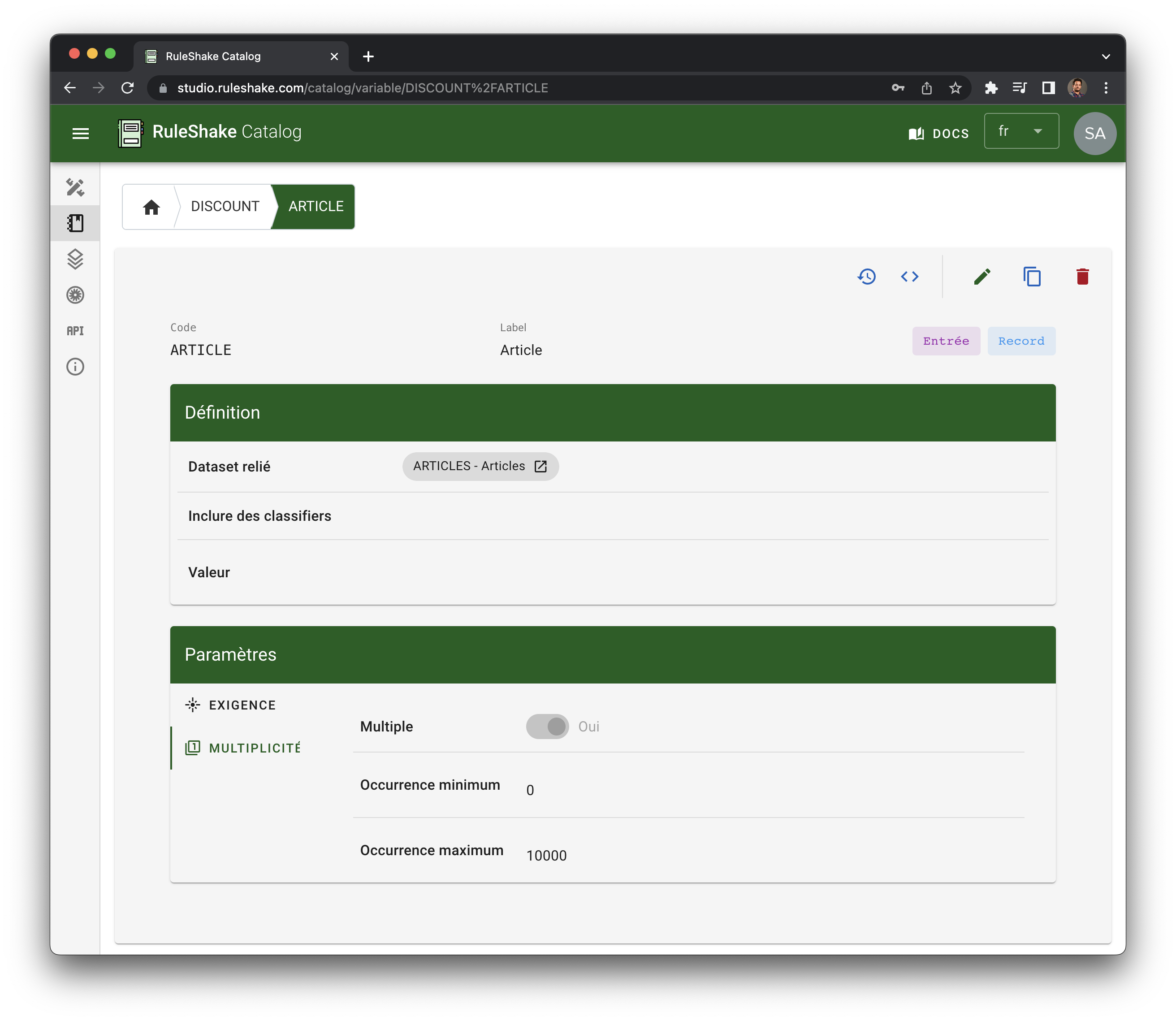ARTICLE: une variable d'entrée qui représente un article ajouté dans le panier. Cette variable est multiple, elle peut donc recevoir plusieurs valeurs. Elle est de typeRecord, elle est donc liée à un dataset défini dans RuleShake Referential.DISCOUNTS: une variable calculée de typeComposite. Cela veut dire que cette variable n'a pas de valeur directe, mais contient des sous-variables.